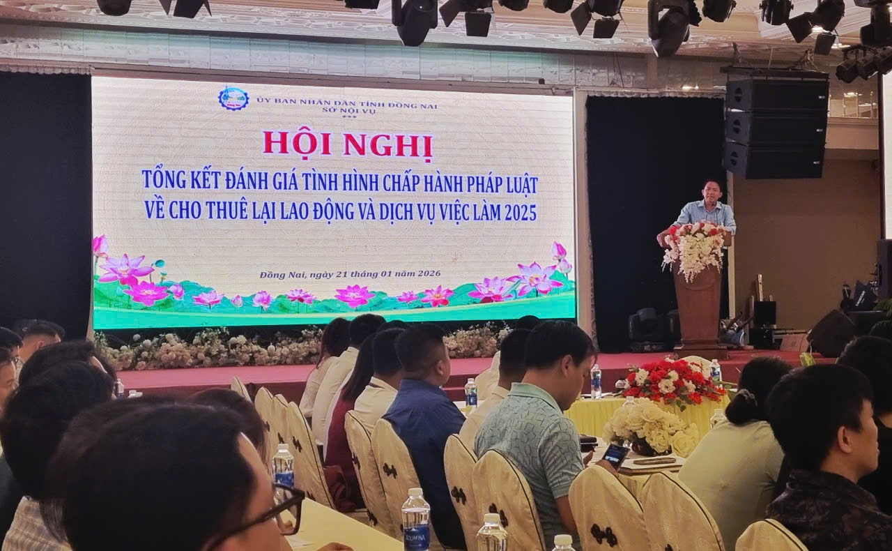 Ngày 21/01/2026, tại Hội trường khách sạn Đồng Nai, Sở Nội vụ tổ chức Tổng kết đánh giá tình hình chấp hành pháp luật về cho thuê lại lao động và dịch vụ việc làm năm 2025. Tham dự hội nghị có ông Mai Xuân Tân - Phó Giám đốc Sở, ông Nguyễn Trí Phăng - Phụ trách phòng Lao động - Sở Nội vụ cùng 85 đại biểu địa diện cho 72 doanh nghiệp hoạt động cho thuê lại lao động và hoạt động dịch vụ việc làm trên địa bàn tỉnh.