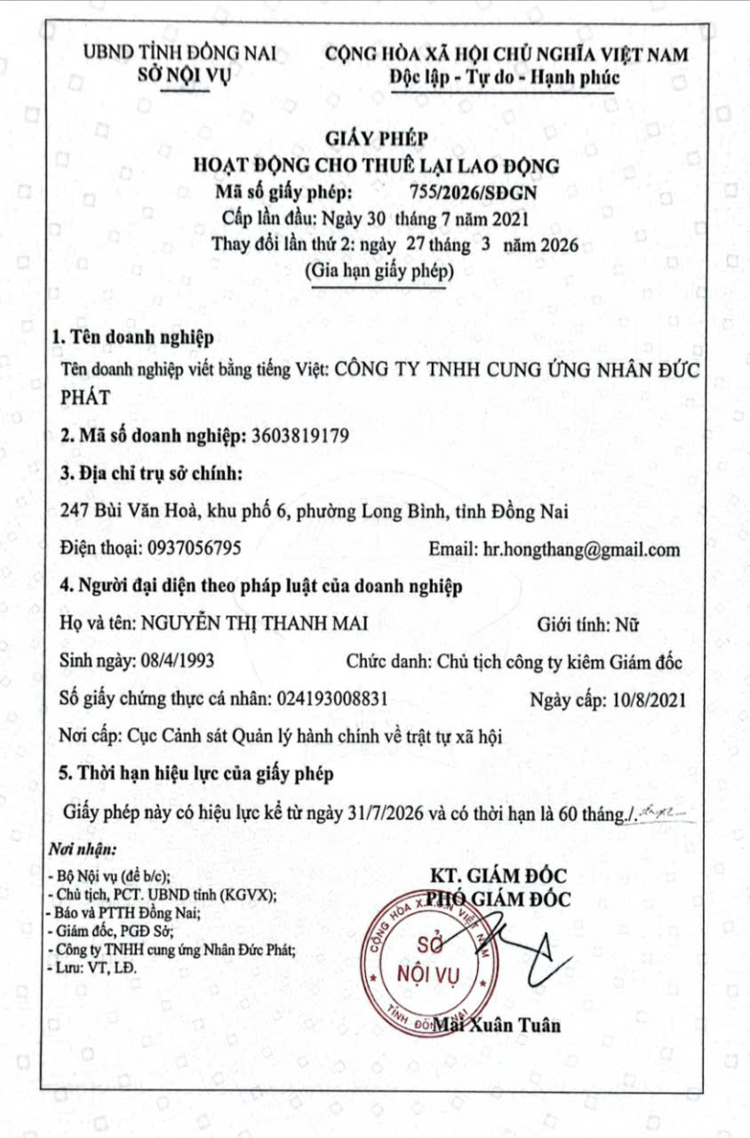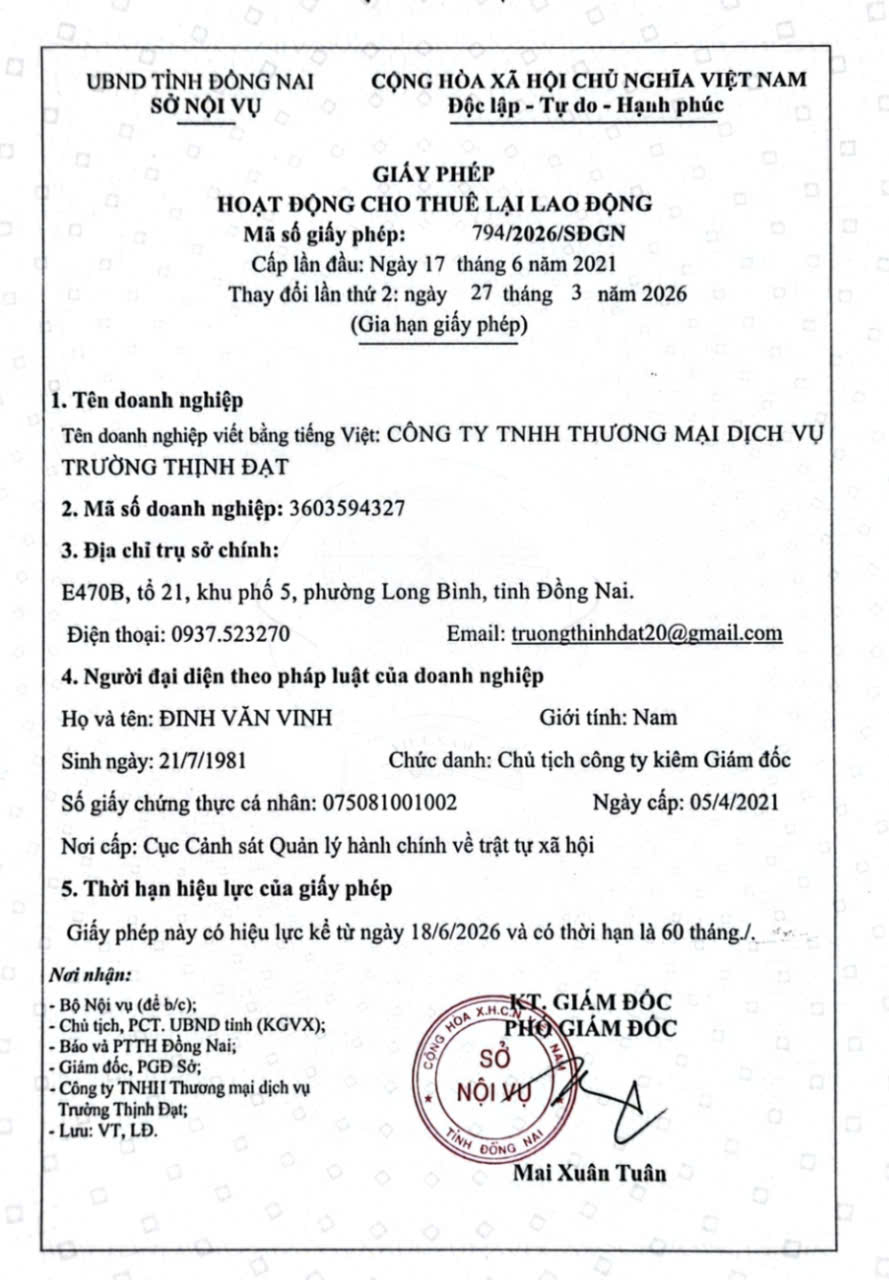 Thực hiện Quyết định số 584/QĐ-UBND ngày 29 tháng 7 năm 2025 của Chủ tịch Ủy ban nhân dân tỉnh về việc ủy quyền cấp, gia hạn, cấp lại, thu hồi giấy phép hoạt động cho thuê lại lao động và ban hành thông báo đồng ý về việc rút tiền ký quỹ hoạt động cho thuê lại lao động, quyết định trích tiền ký quỹ hoạt động cho thuê lại lao động đối với các doanh nghiệp trên địa bàn tỉnh Đồng Nai. Ngày 27/3/2026, Phó Giám đốc Sở Nội vụ - Ông Mai Xuân Tuân đã ký cấp gia hạn Giấy phép hoạt động cho thuê lại lao động, mã số giấy phép 755/2026/SĐGN đối với Công ty TNHH cung ứng Nhân Đức Phát, địa chỉ trụ sở chính tại: 247 Bùi Văn Hoà, khu phố 6, phường Long Bình, tỉnh Đồng Nai, mã số doanh nghiệp: 3603819179 và mã số giấy phép 794/2026/SĐGN đối với Công ty TNHH Thương mại dịch vụ Trường Thịnh Đạt, địa chỉ trụ sở chính: E470B, tổ 21, khu phố 5, phường Long Bình, tỉnh Đồng Nai, mã số doanh nghiệp: 3603594327 (GP đính kèm).