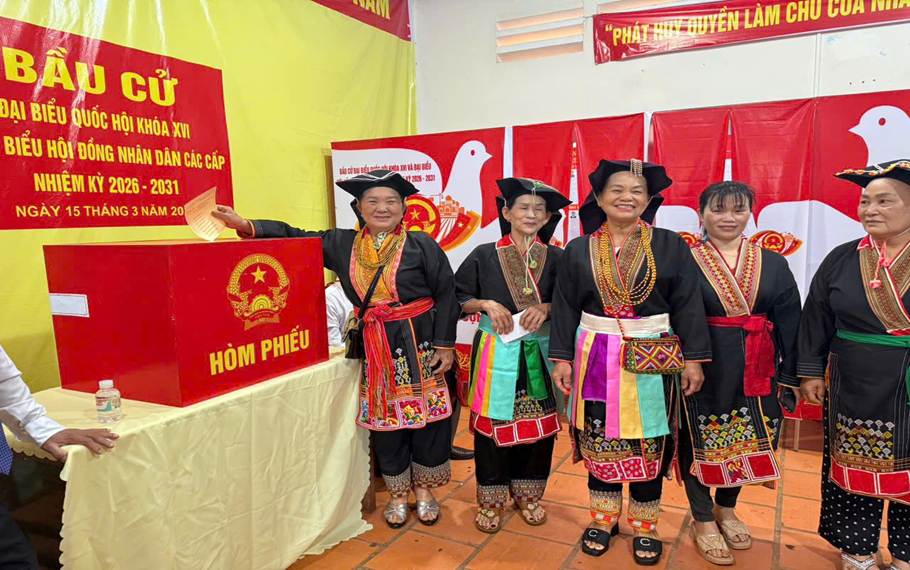 <p style="margin-left:0cm;text-align:justify;">Ngày bầu cử diễn ra trong không khí trang trọng, phấn khởi và trật tự. Tại các khu vực bỏ phiếu, cử tri đến từ sớm, thực hiện quyền và nghĩa vụ công dân với tinh thần trách nhiệm cao. Kết quả, tỷ lệ cử tri đi bầu đạt mức rất cao: Đối với bầu cử đại biểu Quốc hội và HĐND cấp tỉnh đạt 99,62%; Đối với cấp xã đạt 99,69%. Đây là minh chứng rõ nét cho tinh thần trách nhiệm, ý thức công dân và niềm tin của Nhân dân đối với Đảng, Nhà nước và chính quyền địa phương.</p>
