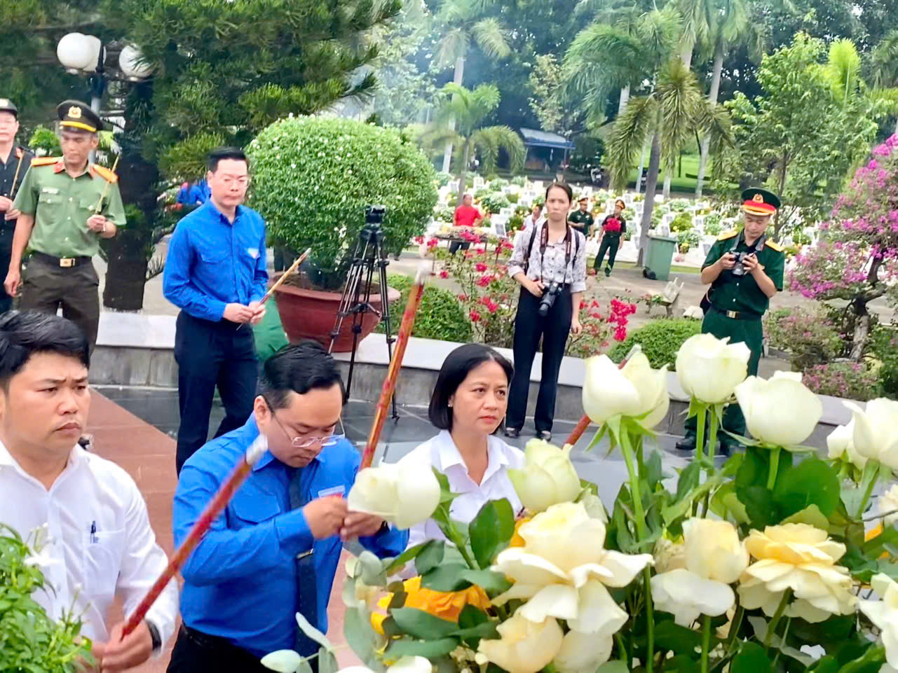 Hình Đồng chí Đoàn Thị Thu Thủy - Phó Giám đốc Sở Nội vụ (áo trắng) cùng Đoàn viên Chi đoàn thắp hương tại Nghĩa trang Liệt sỹ tỉnh