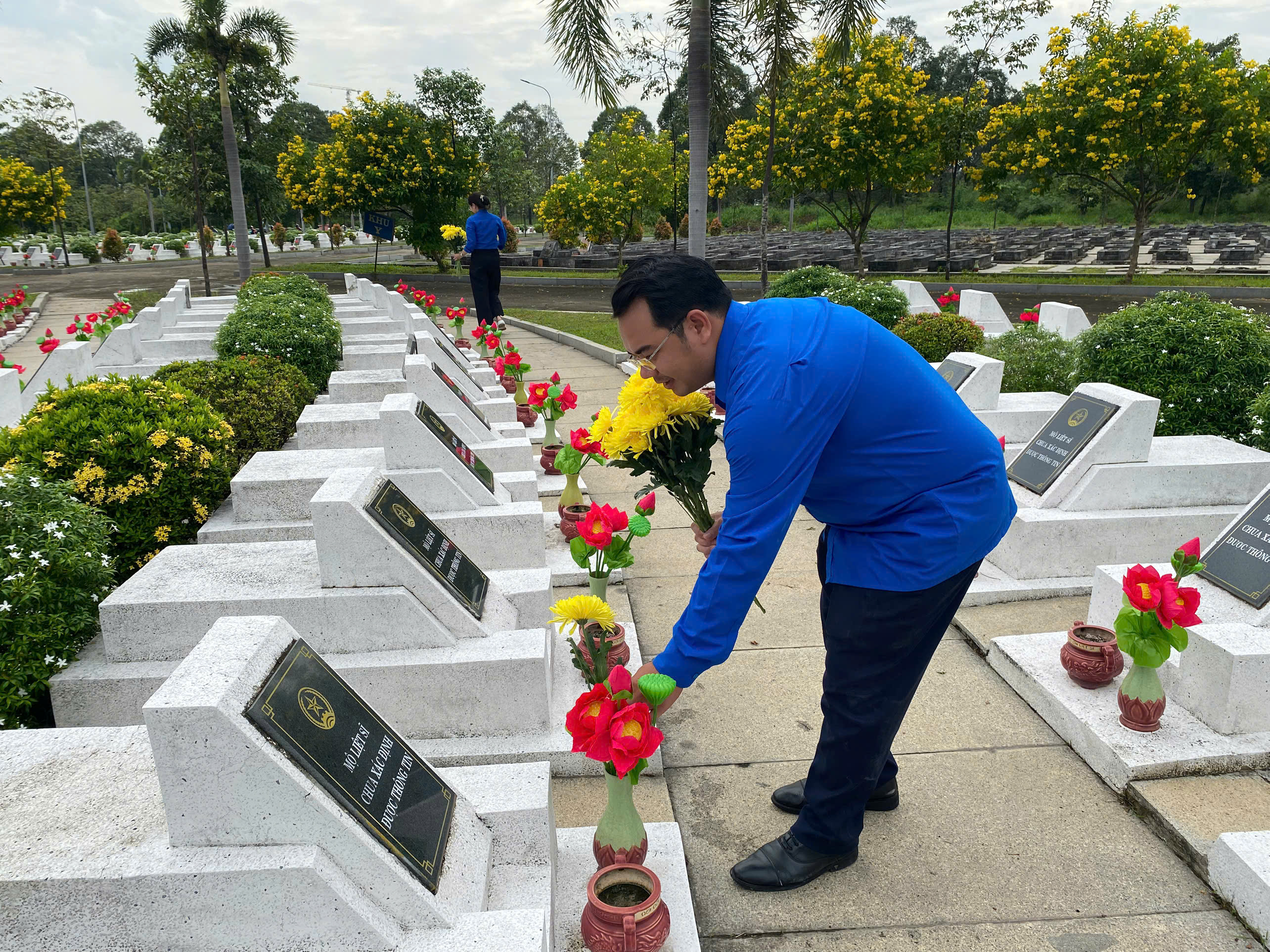 Hình Đoàn viên Chi đoàn phối hợp Chi đoàn Cảnh sát cơ động Đông Nam Bộ tổ chức quét dọn, cắm hoa tại các phần mộ liệt sỹ