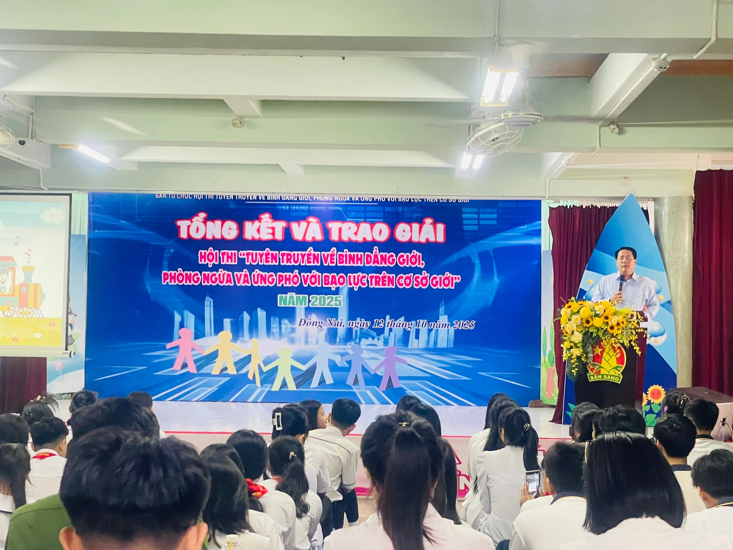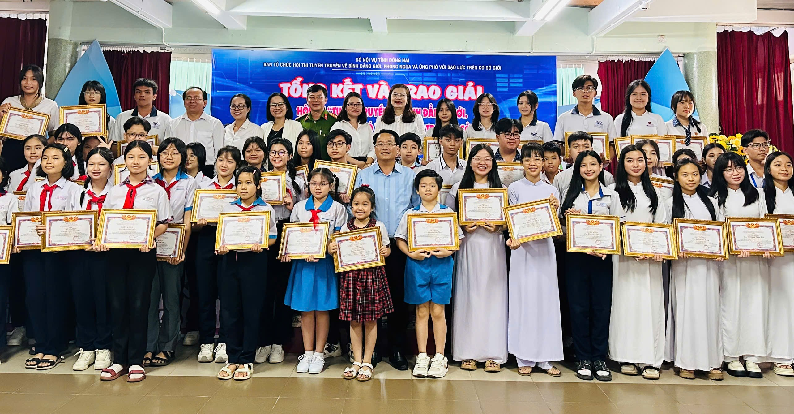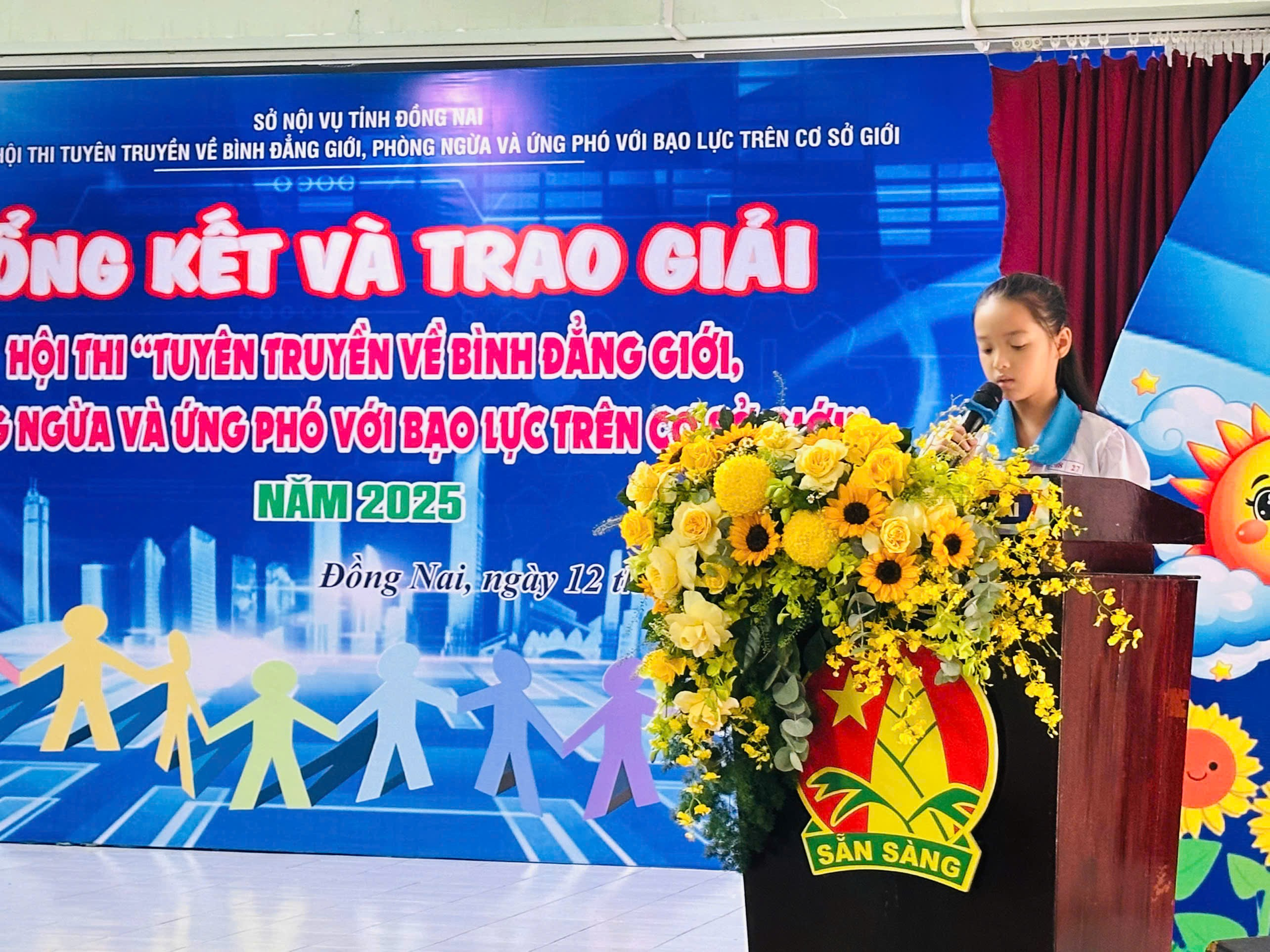 Thực hiện kế hoạch số 010/KH-SNV ngày 01/8/2025 của Sở Nội vụ về việc tổ chức Hội thi “Tuyên truyền về bình đẳng giới, phòng ngừa và ứng phó với bạo lực trên cơ sở giới” năm 2025. Sáng ngày 12/10/2025, tại Nhà Thiếu nhi tỉnh Đồng Nai, đã diễn ra buổi Tổng kết và Trao giải cho 72 thí sinh xuất sắc nhất trong số 3.771 thí sinh tham dự 03 phần thi của Hội thi “Tuyên truyền về bình đẳng giới, phòng ngừa và ứng phó với bạo lực trên cơ sở giới” năm 2025 (Hội thi). Hội thi do Sở Nội vụ chủ trì phối hợp với các sở, ngành liên quan và Nhà Thiếu tỉnh tổ chức đã chính thức khép lại với những thành công rực rỡ, thu hút sự tham gia đông đảo của các em học sinh trên toàn tỉnh. Hội thi không chỉ tạo ra một sân chơi giáo dục ý nghĩa mà còn góp phần lan tỏa mạnh mẽ các thông điệp về bình đẳng giới và phòng chống bạo lực trong cộng đồng.